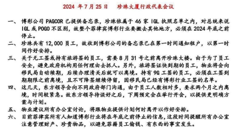 一、博彩公司 PAGCOR已提供备忘录,珍珠依属于46家IGL执照名单之内,对总统来说 IGL或POGO不区别,故整个菲律宾博彩行业要搬去其他地方,必须在2024年底之前 停止。