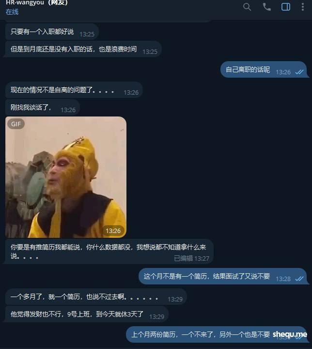 我告诉你们自从他来了就没把他当老大看,除了见面当着他假装笑嘻嘻在公司的零食饮料我就拼命多喝喝不完我就带回来,老娘管你是什么,现在说什么没业绩就要让我自己考虑是继续留着岗位还是离职,如果没业绩被开除就没有底薪,最后被我跟那个所谓的胖总监说我自己离职就给我正常算工资,这让我天天在家等护照等了十几天才下来,还扣我钱