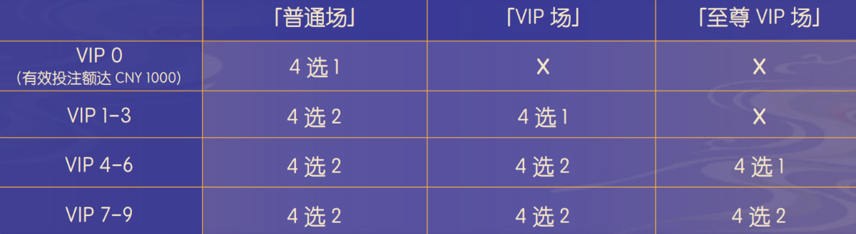 c)「至尊 VIP 场」: i. VIP 4-6 的玩家 4 选 1 ii. VIP 7-9 的玩家 4 选 2