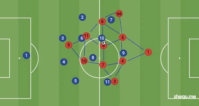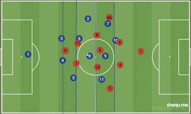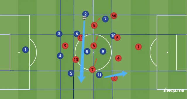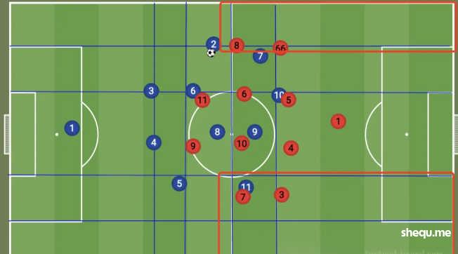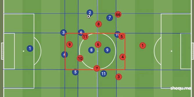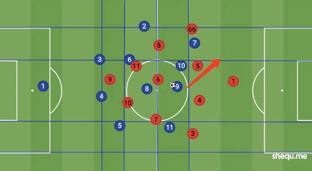 而中场中路有5人,使得球队在中路和肋部的推进当中局部区域有压倒性的过载优势。